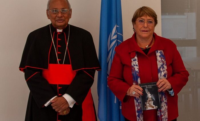 கொழும்பு பேராயர் மல்கம் கர்தினால் ரஞ்சித் ஆண்டகை நேற்று புதன்கிழமை ஐக்கிய நாடுகள் மனித உரிமை பேரவை உயர்ஸ்தானிகர் மிச்செல் பச்லெட்டை சந்தித்துப் பேசினார். ஜெனிவாவில் நடைபெற்றுவரும் ஐ.நா மனித உரிமைகள் பேரவையின் 49 ஆவது கூட்டத் தொடரில் இந்த சந்திப்பு இடம்பெற்றுள்ளது. உயிர்த்த ஞாயிறு தாக்குதல் தொடர்பில் இலங்கை அரசின் நீதி விசாரணை மீதான நம்பிக்கை தகர்ந்துவிட்டதாக தெரிவித்துள்ள பேராயர் மல்கம் கர்தினால் ரஞ்சித் எமக்கு நீதி வேண்டும் என ஐ.நா உயர்ஸ்தானிகரிடம் கோரிக்கை விடுத்தார். இதற்காக வத்திக்கான் அனுமதியை நாடிய அவர், வத்திக்கான் சென்று பாப்பரசர் பிரான்சிஸை சந்தித்துப் பேசிய பின்னர் ஜெனிவா சென்றுள்ளமை குறிப்பிடத்தக்கது.