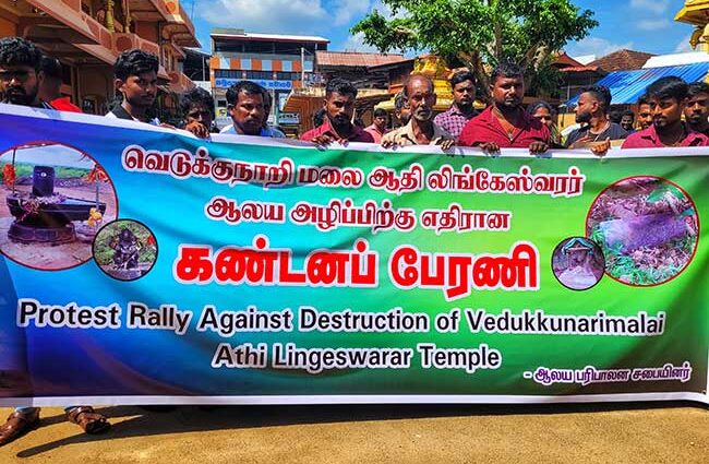 வவுனியா வெடுக்குநாறிமலை ஆதிசிவன் ஆலய விக்கிரகங்கள் உடைத்து அழிக்கப்பட்டமைக்கு கண்டனம் தெரிவித்தும், நீதி கோரியும் வவுனியாவில் மாபெரும் ஆர்ப்பாட்ட பேரணி ஒன்று இடம்பெற்றது.